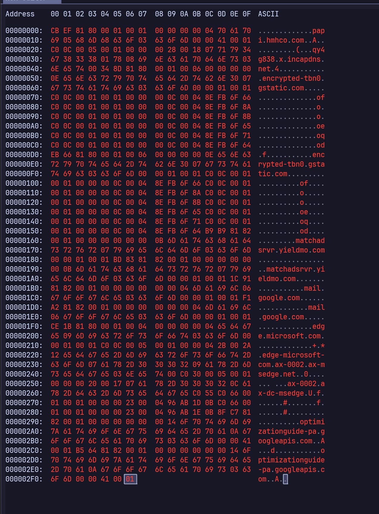 The packet was sent 28,700 times (40 seconds), and DNS requests were logged. These requests were confirmed not to have been made from the test machine. A 2nd machine was tried with domains that are known not to exist, but due to the heavy traffic, the machine’s queries weren’t logged. The following domains were confirmed to have never been queried by the test machine.